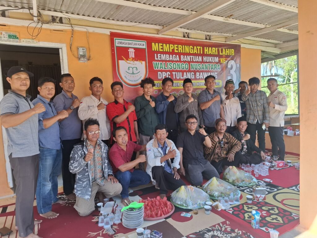 Tulang Bawang,walisongonusantaranews.com_30 November 2025 – Lembaga Bantuan Hukum (LBH) Walisongo Nusantara Dewan Pimpinan Cabang (DPC) Tulang Bawang menggelar peringatan Hari Ulang Tahun (HUT) ke-3 yang dipusatkan di Sekretariat LBH, Jalan Anggur, Kampung Gedung Karya Jitu, Minggu (30/11/2025). Kegiatan berlangsung khidmat dan mendapat sambutan positif dari masyarakat.